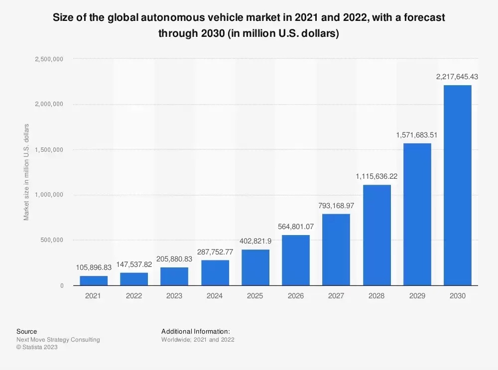 According to an autonomous vehicle market forecast by Next Move Strategy Consulting, the global autonomous vehicle market is projected to reach a size of over $2.3 trillion by 2030, as shown in the chart below.