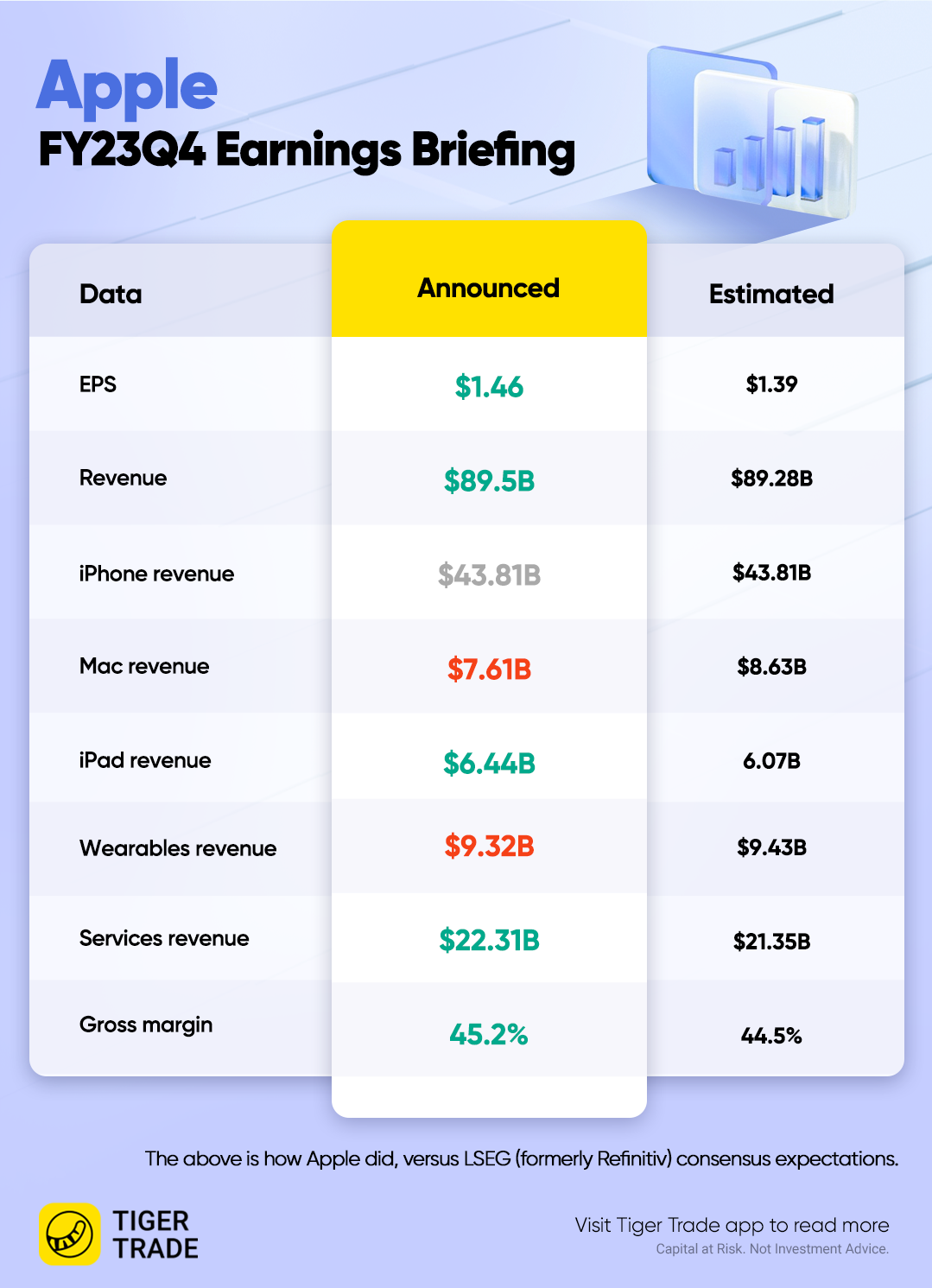 For the September quarter, Apple $(AAPL.UK)$ reported iPhone revenue of $43.8 billion, up from $42.6 billion a year before, matching the FactSet consensus. The September quarter included just over a week's worth of sales of the new iPhone 15 lineup, which came out amid investor concerns about spending trends and China competition.