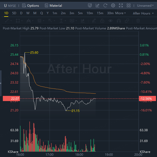 Unity Software Inc.'s stock fell about 13% in extended trading Thursday after the company reported a revenue miss and withheld from offering guidance.