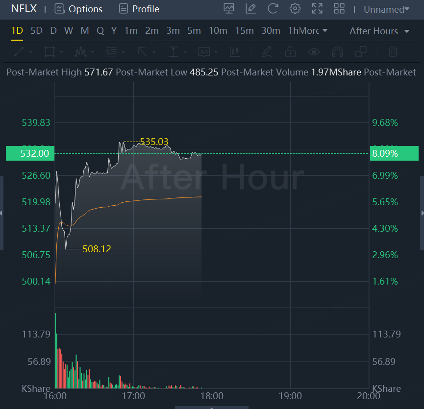 Netflix Inc.'s stock popped 8% after hours Tuesday following its quarterly results, which showed a splurge in ad-fueled sales and a healthy increase in new subscribers.