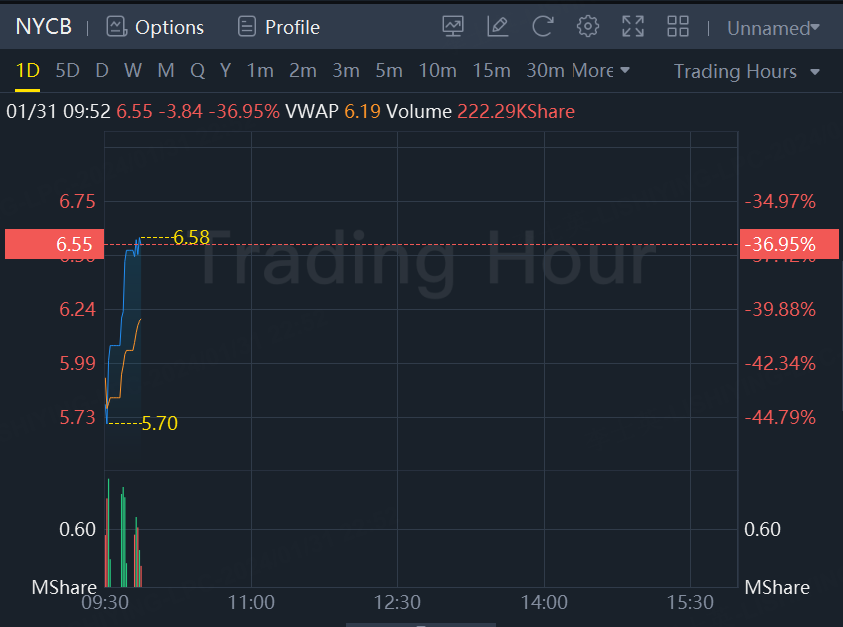 Shares of New York Community Bancorp fell after the parent of Flagstar Bank swung to a fourth-quarter loss and slashed its dividend to shore up capital in the aftermath of its purchase of the assets of the collapsed Signature Bank.