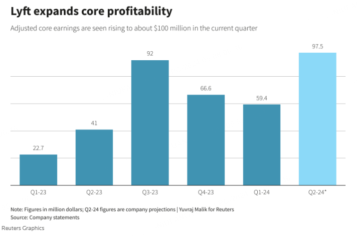 Lyft forecast adjusted earnings before interest, taxes, depreciation and amortization (EBITDA) between $95 million and $100 million, surpassing analysts' average expectations of $81.1 million.