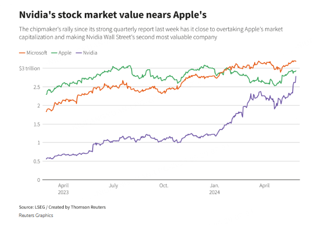 May 28 (Reuters) - Nvidia's shares rallied around 7% to hit a record high on Tuesday. As of the end of Tuesday’s session, Nvidia had a $2.801 trillion valuation, while Apple had a $2.913 trillion valuation. That meant the margin between the two was $112 billion.