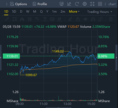 Its stock surged as much as 8% to $1,149.39 during the session, an intra-day record high. Apple's stock was down 0.2% in afternoon trading.
