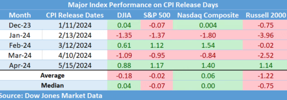 The S&P 500 and Dow industrials averaged small declines of 0.02% and 0.18%, respectively, on the past five CPI days this year. This contrasts with their 10-year averages of a 0.02% gain and a 0.06% decline on CPI days.