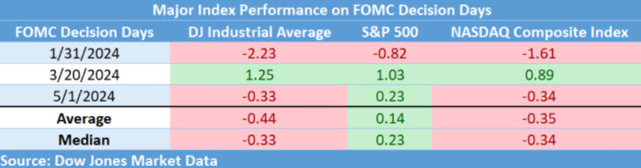 However, the S&P 500 only averaged a 0.1% gain on three Fed decision days this year, while the Dow and the Nasdaq each booked an average decline of around 0.4% in the same period, according to Dow Jones Market Data (see table below).