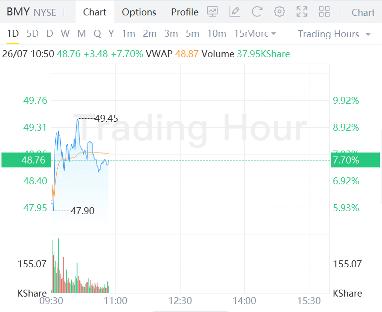 The company said sales of Opdivo rose 11% to $2.4 billion in the second quarter. Sales of anemia drug Reblozyl rose 82% from last year to $425 million and Camzyos sales more than tripled to $139 million.