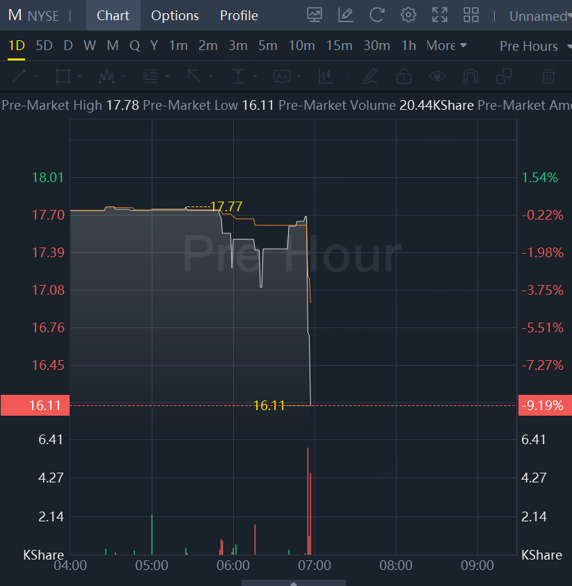 Macy's lowered its annual net sales forecast on Wednesday as lingering weakness in U.S. consumer spending dashes hopes of a turnaround in demand for big-ticket discretionary goods, sending its shares down 9% in premarket trade.