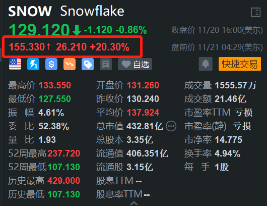格隆汇11月21日|云数据平台Snowflake(SNOW.US)盘前大涨20.3%,报155.33美元。财报显示,Snowflake2025财年第三季度营收为9.42亿美元,同比增长28.3%,超出市场预期的8.98亿美元。非公认会计准则下,每股收益为0.20美元,高于市场预期的0.15美元。Snowflake预计在截至1月份的财季中,产品收入将在9.06亿美元至9.11亿美元之间,远高于8.907亿美元的预期。(格隆汇)
