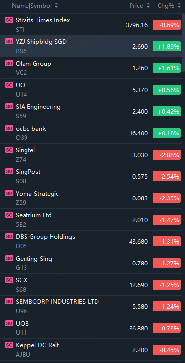 Singtel fell 3%, SingPost fell 2.5%, Yoma Strategic fell 2.4%, DBS fell 1.3%, UOB fell 1%; YZJ Shipbldg rose 2%.