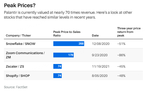 At Tuesday's close, Palantir was trading at 67 times its sales over the last 12 months. The S&P 500 index trades at 3.2 times sales. History suggests Palantir's stock could be peaking, at least in the short to medium term.