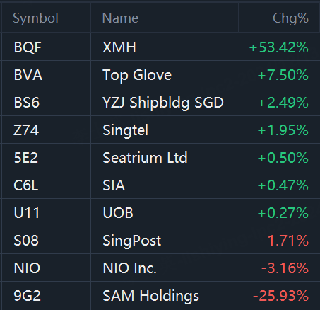 In company news, shares of XMH Holdings (SGX:BQF) surged over 53% after the company's profit attributable to owners of the company surged 95% in the fiscal first half ended Oct. 31 to SG$12.6 million from SG$5.1 million a year earlier.