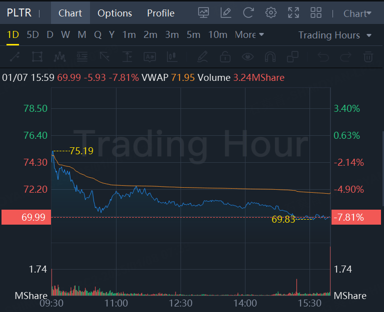 Palantir stock fell 7.8% to $69.99 and was the worst performer in the S&P 500 on Tuesday as the index dropped 1.1%. This was the stock's largest percentage decrease since May 7, 2024, according to Dow Jones Market Data -- a notable move for the stock that had a stand out year in 2024.