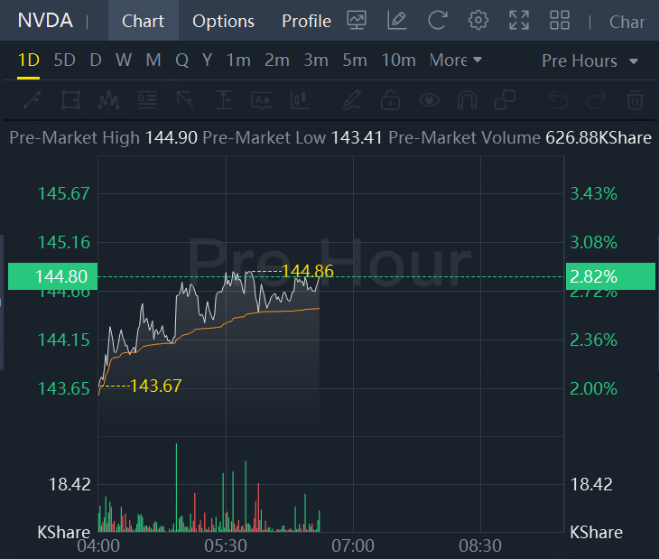 Nvidia shares are up 2.8% to $144.80 in premarket trading Wednesday. Shares rose 2.3% Tuesday and are up 4.9% so far in 2025.