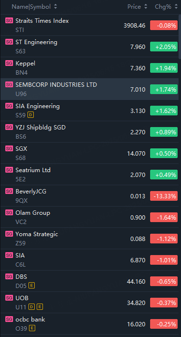 STI fell 0.1%; ST Engineering, Keppel, Sembcorp up 2%; YZJ Shipbldg rose 1%; Beverly JCG fell 13%; SIA, DBS fell 1%.