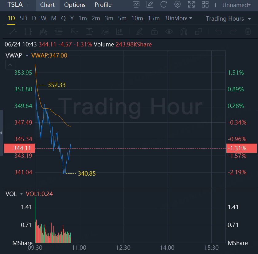 Shares of the electric-vehicle maker were down 1.3% at $344.11.