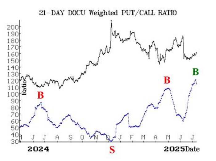A new weighted put-call ratio buy signal has arisen in DocuSign (DOCU), which is attempting to recover from its most recent negative earnings report. A share-price move above $80 would be positive confirmation of this buy signal.