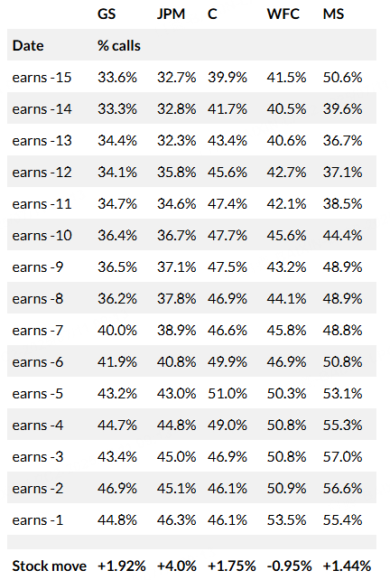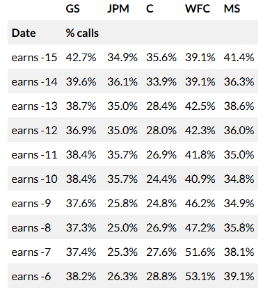 The GS column shows that the percentage of call volume was increasing going into the first-quarter earnings report, and the stock rose 1.92%. JPM had a similar increase in call volume prior to the earnings, and the stock was up 4.0% - a strong move. In fact, all of the stocks showed an increase in the percentage of calls. All but Wells Fargo (WFC) were higher.