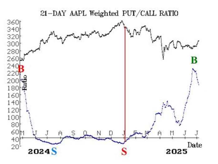 There is a new weighted put-call ratio buy signal in Apple (AAPL). AAPL options are somewhat expensive right now, so we are recommending a call bull-spread instead of an outright call purchase.