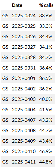 In the case of Goldman, let's look at last quarter, when earnings were reported on April 14. The following table shows the 15 days leading up to the earnings, ending with Friday, April 11. The percentage of total options volume in GS that was call options is shown in this table.