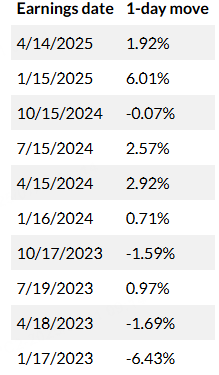 How does this compare with recent postearnings actual moves? The following table shows the one-day moves in GS after each of the previous 10 earnings reports.