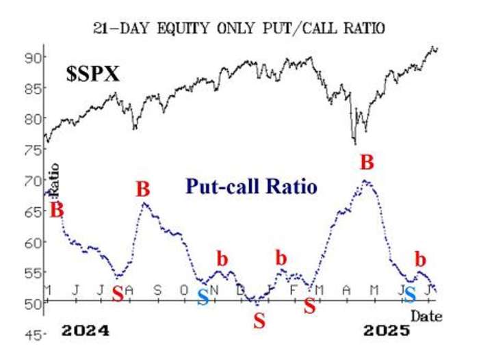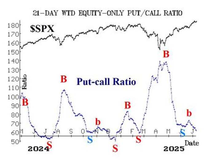 Equity-only put-call ratios have continued to fall. That is bullish for stocks, and as long as these ratios are declining, stocks can advance. The fact that they are making new relative lows on their charts is something of an overbought condition, but it won't be a sell signal unless these ratios reverse upward and begin to trend higher.