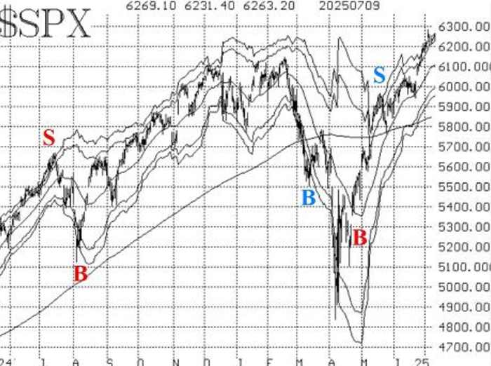 When SPX is at all-time highs, there is no formal overhead resistance, but the "modified Bollinger bands" (mBB) can be useful. Currently, SPX is trading above the +4<SIGMA> band, which is an overbought condition, but not necessarily a sell signal. If SPX closes below the +3<SIGMA> band, that would generate what we call a "classic" mBB sell signal. We don't trade those, for they have proven to be too subject to whipsaws. However, if there is further downside action after the "classic" sell signal is generated, then a McMillan volatility band (MVB) sell signal could be generated. There is no guarantee that current market conditions will actually lead to an MVB sell signal.