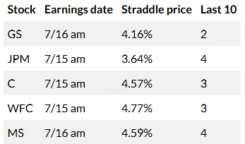Next week, the largest U.S. banks - Goldman Sachs Group (GS), JPMorgan Chase (JPM), Citigroup (C), Wells Fargo (WFC) and Morgan Stanley (MS) - will report earnings. Although these banks are covered by a large number of analysts, sometimes the options market will give us a clue as to what, if any, earnings surprises might be in store.
