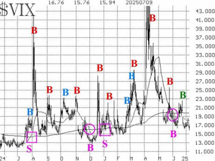 VIX VIX has continued to remain subdued, even during most negative news flashes. So that means that both buy signals related to VIX are still in place: the "spike peak" buy signal of June 24, and the trend of VIX buy signal of June 4 (both are marked on the right-hand side of the accompanying VIX chart). These will remain in place as long as VIX remains below its 200-day moving average.