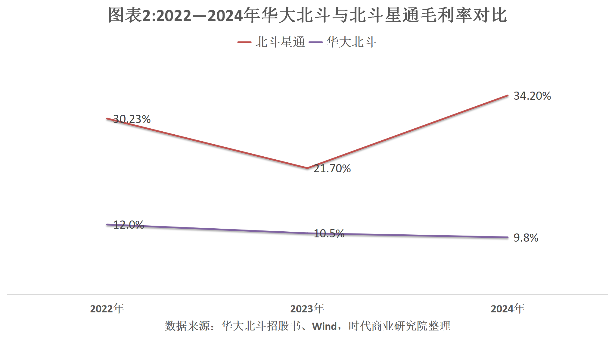 2022—2024年,华大北斗的毛利率分别为12%、10.5%、9.8%,呈持续下降趋势,且2024年已经跌至“个位数”。而北斗星通(002151)(002151.SZ)作为该公司的同行公司,数据显示,同期,其毛利率分别高达30.23%、21.70%、34.20%,其间一度大幅下降,但是仍远高于华大北斗。