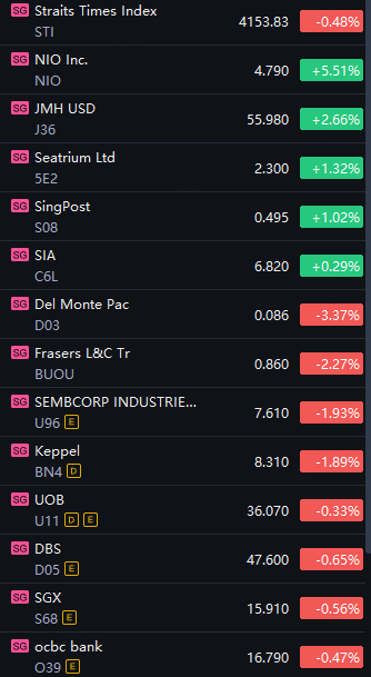 The Straits Times Index (STI), a key benchmark for the Singapore Exchange, ranged between 4,151.44 and 4,195.01 throughout the day. It ended the session at 4,153.83, down 19.94 points or 0.48% compared to Thursday's close.