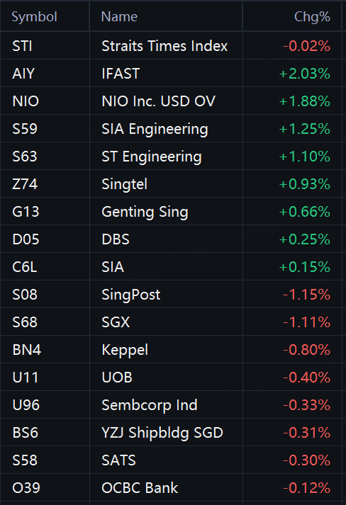 The Straits Times Index (STI), a key benchmark for the Singapore Exchange, ranged between 4,322.43 and 4,347.12 throughout the day. It ended the session at 4,337.74, down 0.68 points or 0.02% compared to Monday's close.
