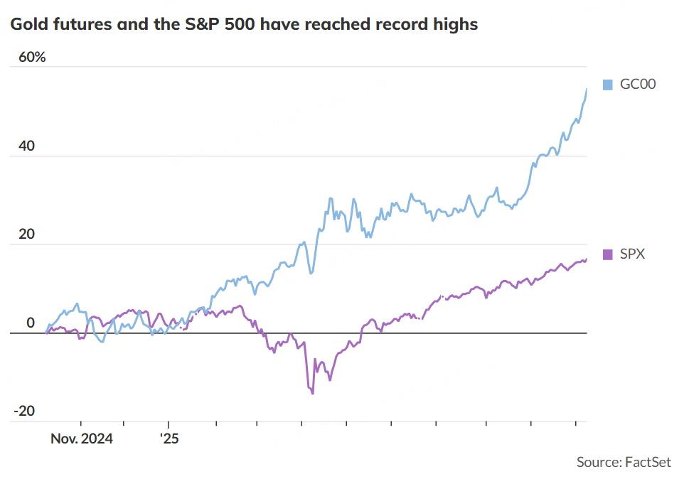 On Wednesday, the December gold futures contract settled at a fresh record high of $4,070.50 an ounce on Comex. The S&P 500 stock index also closed at an all-time high, ending at 6,753 points.