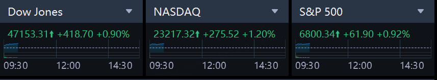 The Dow Jones Industrial average rose 418 points, or 0.9%. The S&P 500 added 0.9%, while the Nasdaq Composite climbed 1.2%. All three major averages reached new all-time intraday highs in the session.