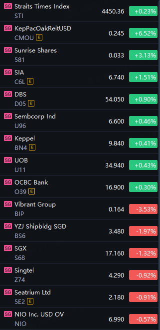 The Straits Times Index (STI), a key benchmark for the Singapore Exchange, ranged between 4,446.38 and 4,478.15 throughout the day. It ended the session at 4,450.36, up 10.06 points or 0.2% compared to Monday's close.