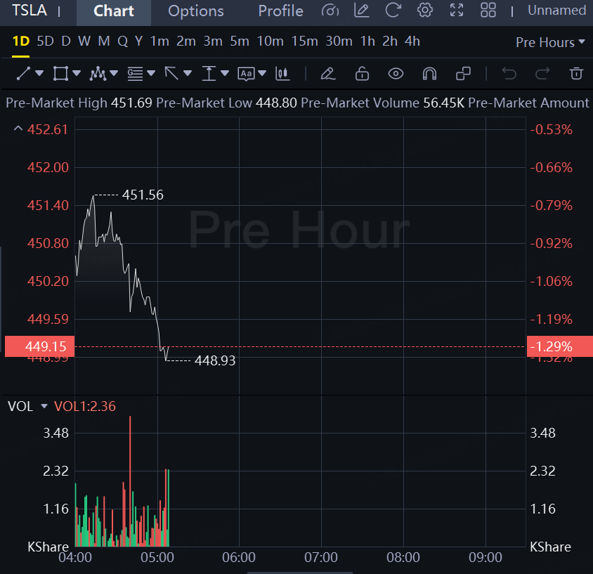 Tesla TSLA.O shares slip over 1% to $449.15 premarket.