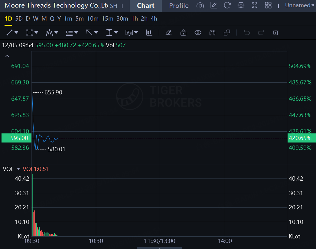 Moore Threads Intelligent Technology (Beijing) (SHA:688795) surged 469% to open at 650 yuan during its first trading day on the Shanghai Stock Exchange Friday.