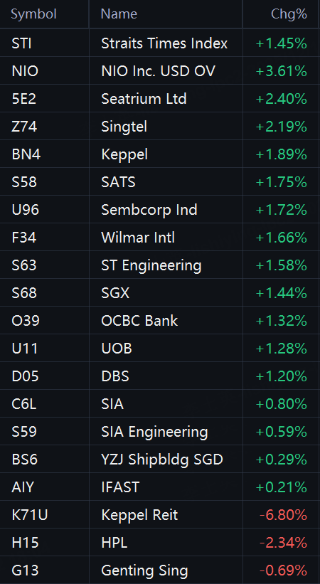 Sembcorp Industries (SGX:U96) was up nearly 2% after it agreed to acquire Australia-based Alinta Energy from Chow Tai Fook Enterprises, an affiliate of Chow Tai Fook Jewellery Group (HKG:1929).