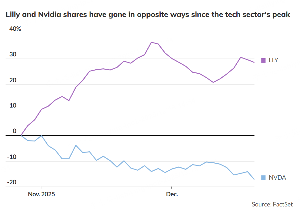 Since the tech sector peaked on Oct. 29, Lilly’s stock has climbed about 30%, while Nvidia’s has lost roughly 14%.