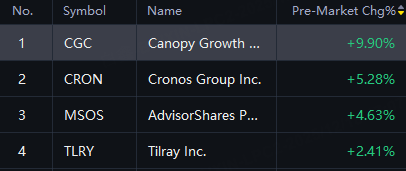 Cannabis stocks jump in premarket; Canopy Growth surged 10%; Cronos and MSOS up 5%; Tilray up 2%.
