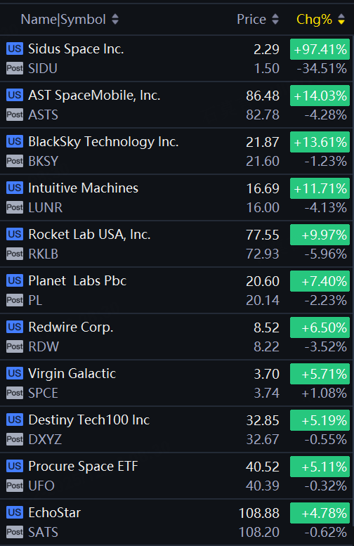 Shares of BlackSky Technology $(BKSY)$, Intuitive Machines (LUNR), Voyager Technologies $(VOYG)$, Redwire $(RDW)$, Planet Labs $(PL)$, Firefly Aerospace $(FLY)$ and Satellogic (SATL) also showed strong gains on Monday. Sidus Space's stock (SIDU) rocketed 97% on Monday after being awarded part of a contract with the U.S. Missile Defense Agency.
