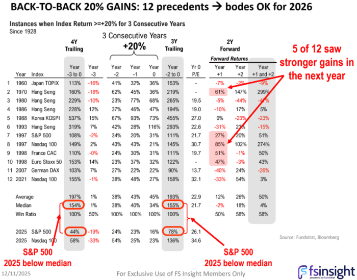 In a report shared with MarketWatch, they looked at periods where equity indexes from around the world gained 20% or more for three consecutive years. They found 12 examples - including the Nasdaq-100 NDX from 1995 to 1997, and the S&P 500 during the same period. During five of the 12 instances, the indexes went on to see even stronger performance during the fourth year, helping to lift the average performance in that year to 12%, Fundstrat found.