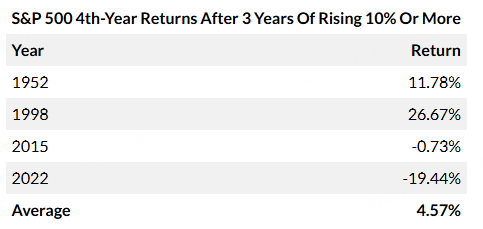 But this is where history diverges with expectations: After such a strong stretch, an analysis by Dow Jones Market Data shows that the average return for the following calendar year was just 4.6%. That's well below 9.5%, the average for all years between 1950 and 2024.