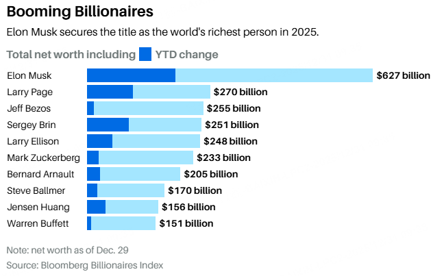 Tesla CEO Elon Musk remained solidly in first place of the billionaire horse race for the year, according to the Bloomberg Billionaires Index, fueled at year end with an approximate $800 billion valuation of SpaceX related to a potential secondary offering reported by The Wall Street Journal. Musk owns about 40% of the space exploration company. His wealth was also boosted by an 18% gain in Tesla shares, the restoration of stock options worth about $138 billion by the Delaware Supreme Court, and the merger of Musk's privately held artificial intelligence company xAI with X.