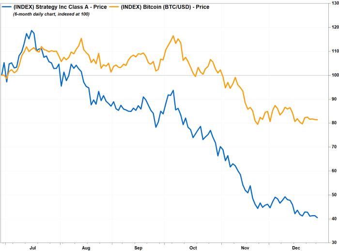 Since bitcoin's price peaked on Oct. 6, the cryptocurrency has fallen about 30%, according to FactSet data, while Strategy's stock has tumbled 56.8%. So far in 2025, bitcoin has lost 6.6% while Strategy shares have shed 46.4%.