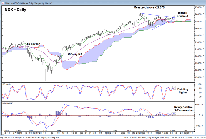 "Triangles often lead to strong short-term moves once resolved," she said. The breakout could send the index as high as 27,075, Stockton said, about 5% higher than its current levels. The S&P 500 SPX could get a boost, too, she said.