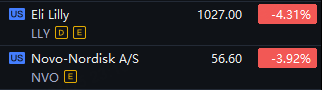 Eli Lilly and Novo Nordisk down 4% in morning trading.