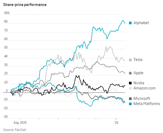 Meanwhile, the others are lagging behind. Apple shares trailed the S&P 500 index last year, when the iPhone maker faced criticism for spending less and losing ground to competitors on AI efforts. Tesla stock, once a market highflier, has vastly underperformed several of its Magnificent Seven peers as sales of its electric vehicles have slowed.