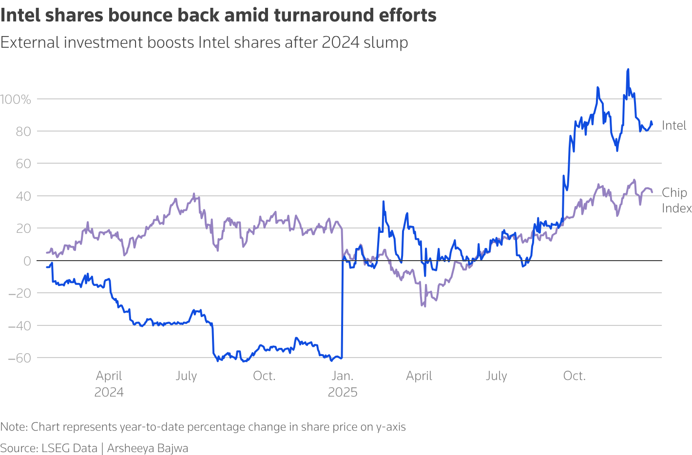 After a more than 60% drop in its share price in 2024, Intel's stock gained 84% in 2025, far outperforming the benchmark semiconductor index's 42% rise.