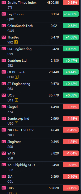 The Straits Times Index (STI), a key benchmark for the Singapore Exchange, ranged between 4,790.43 and 4,814.77 throughout the day. It ended the session at 4,809.88, down 18.12 points or 0.4% compared to Tuesday's close.